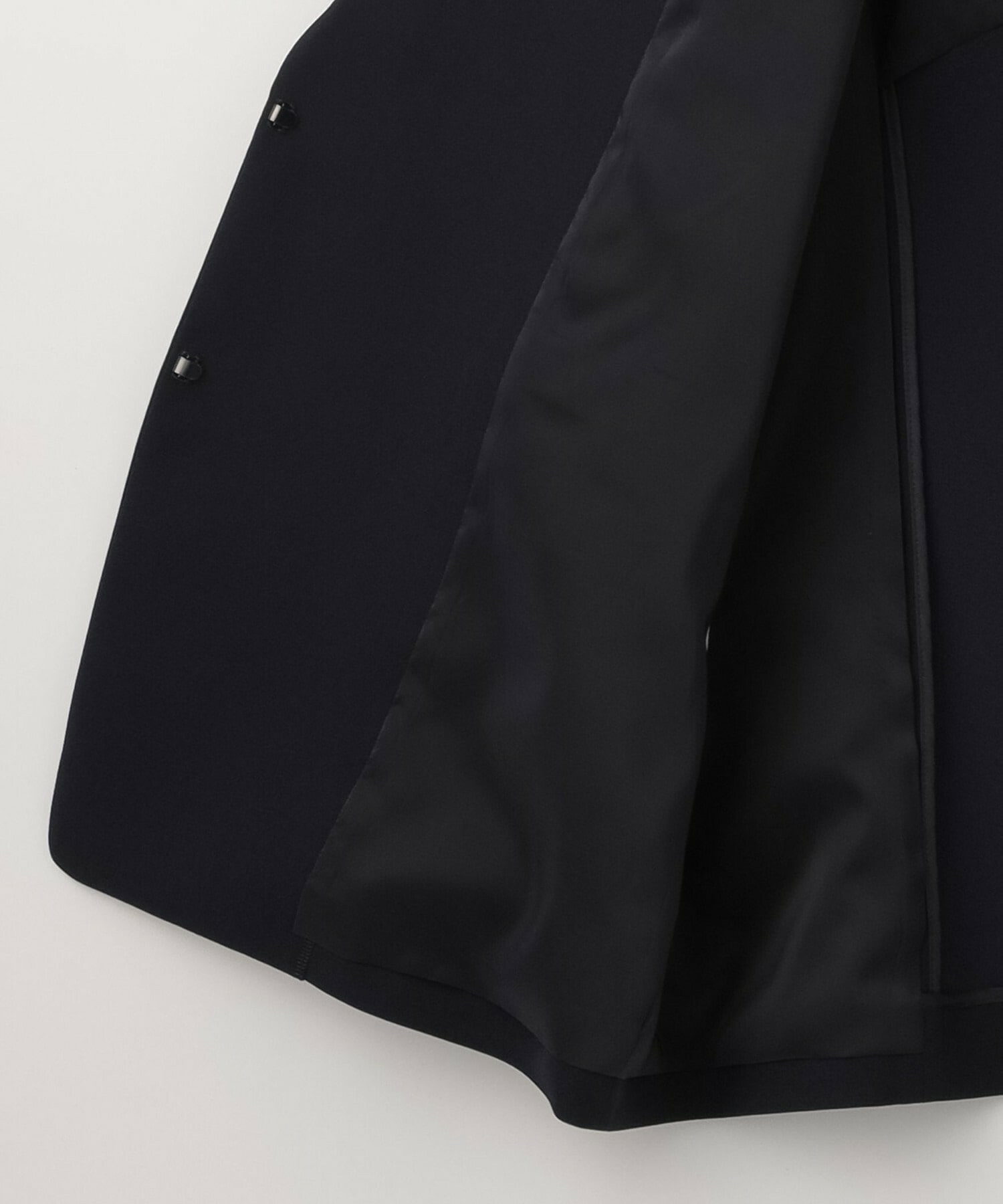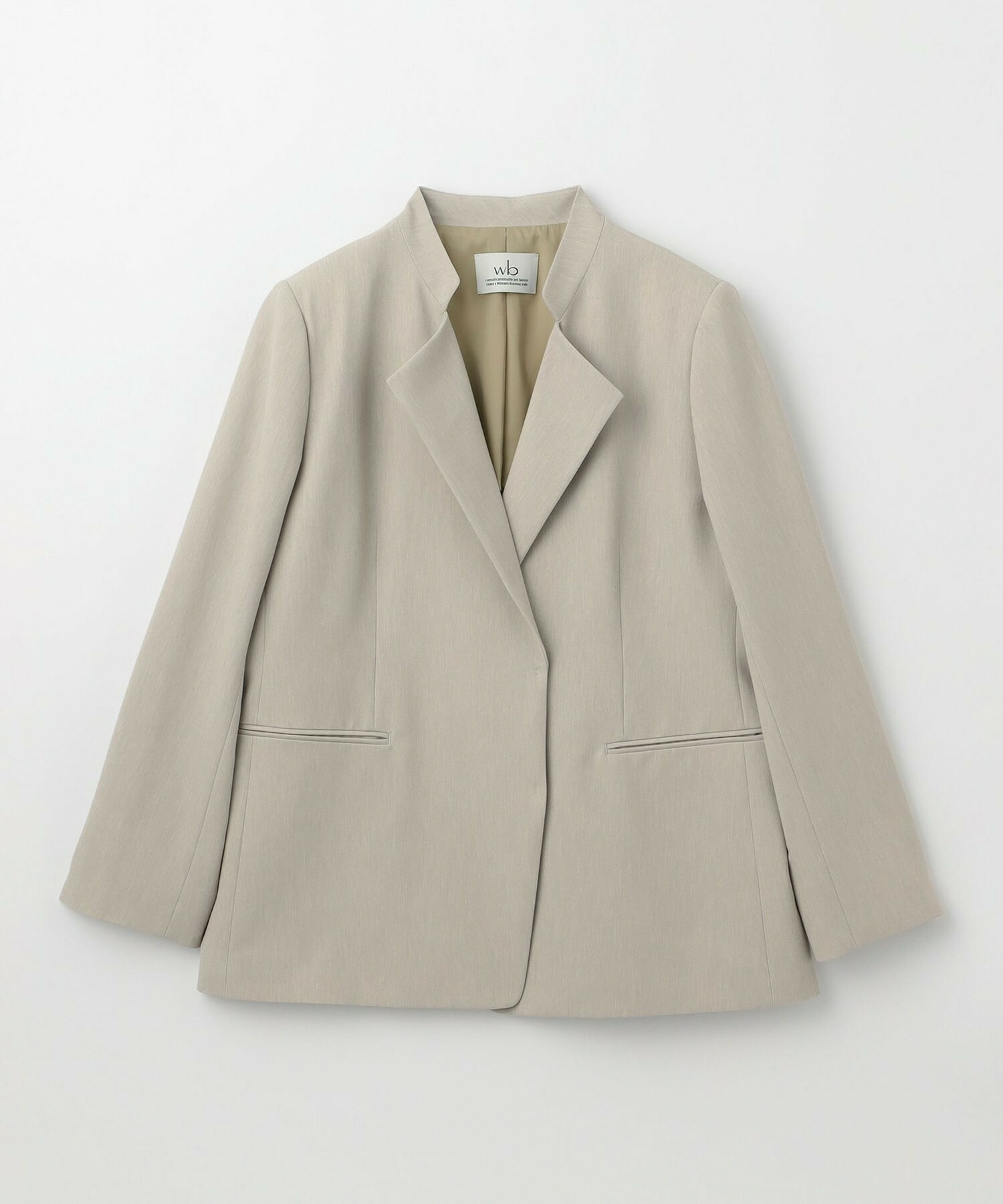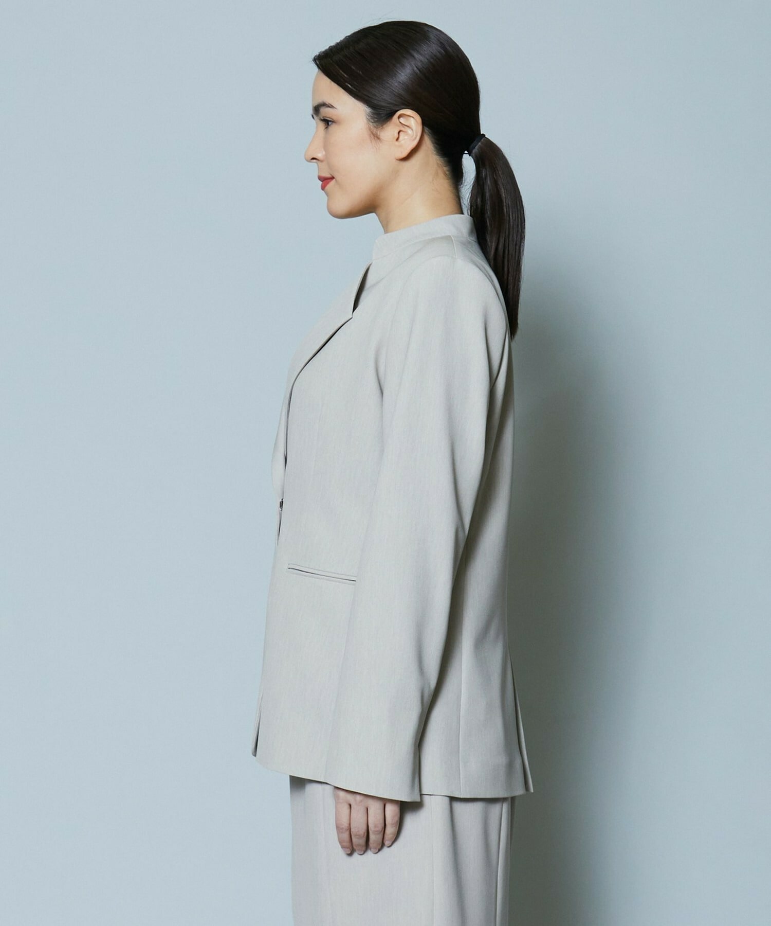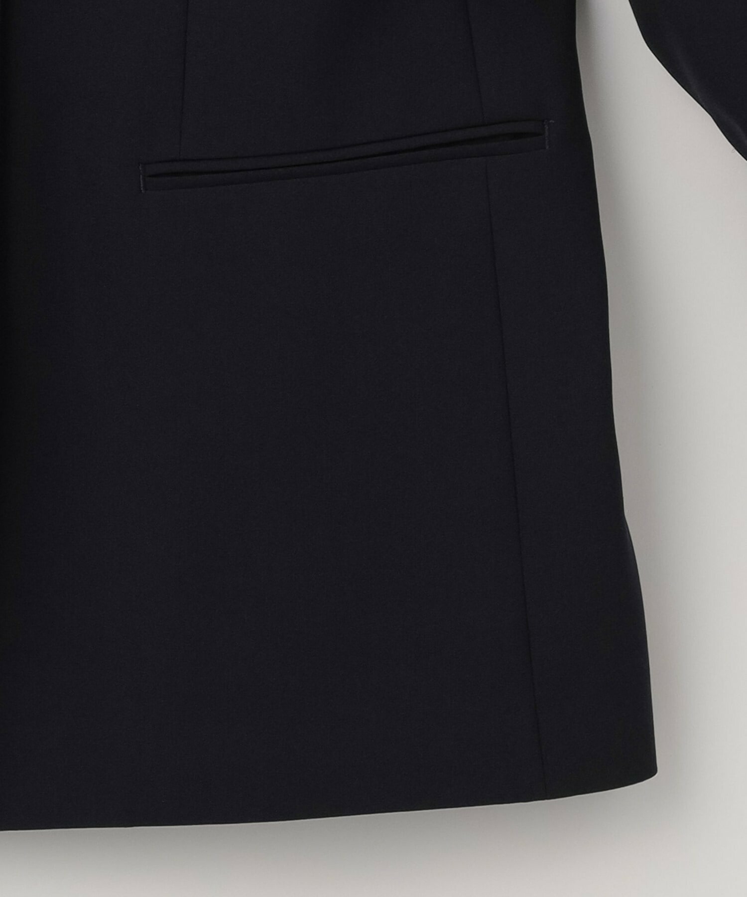 程良くシェイプされたボディサイズに変形テーラー衿のVラインがスッキリ見せてくれるジャケットは、ホック明きなので外して軽く着流ししていただけます。