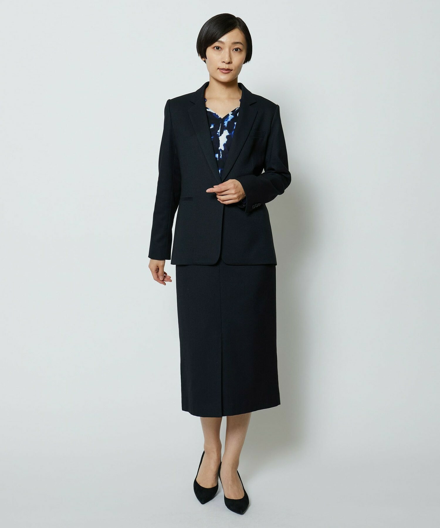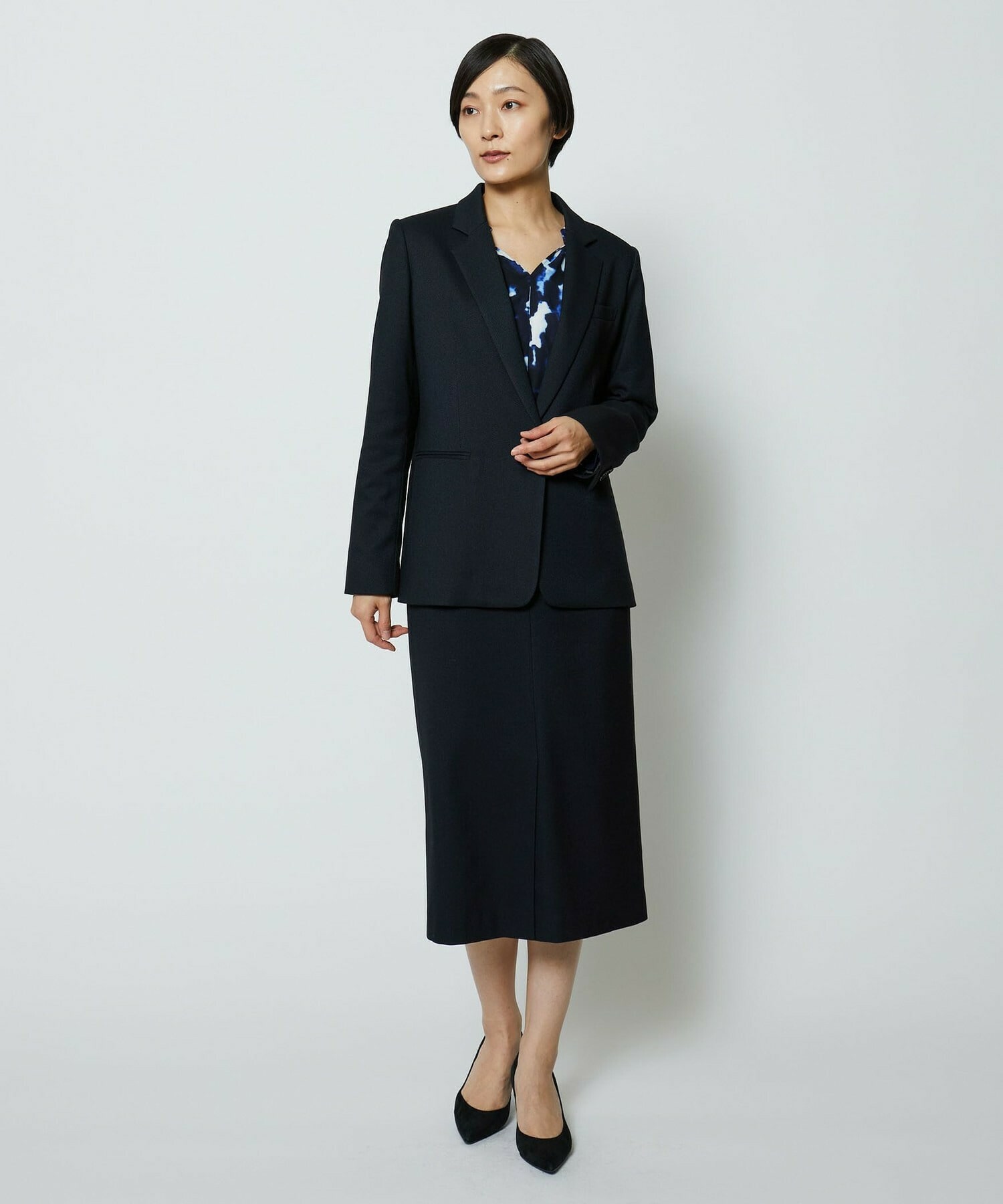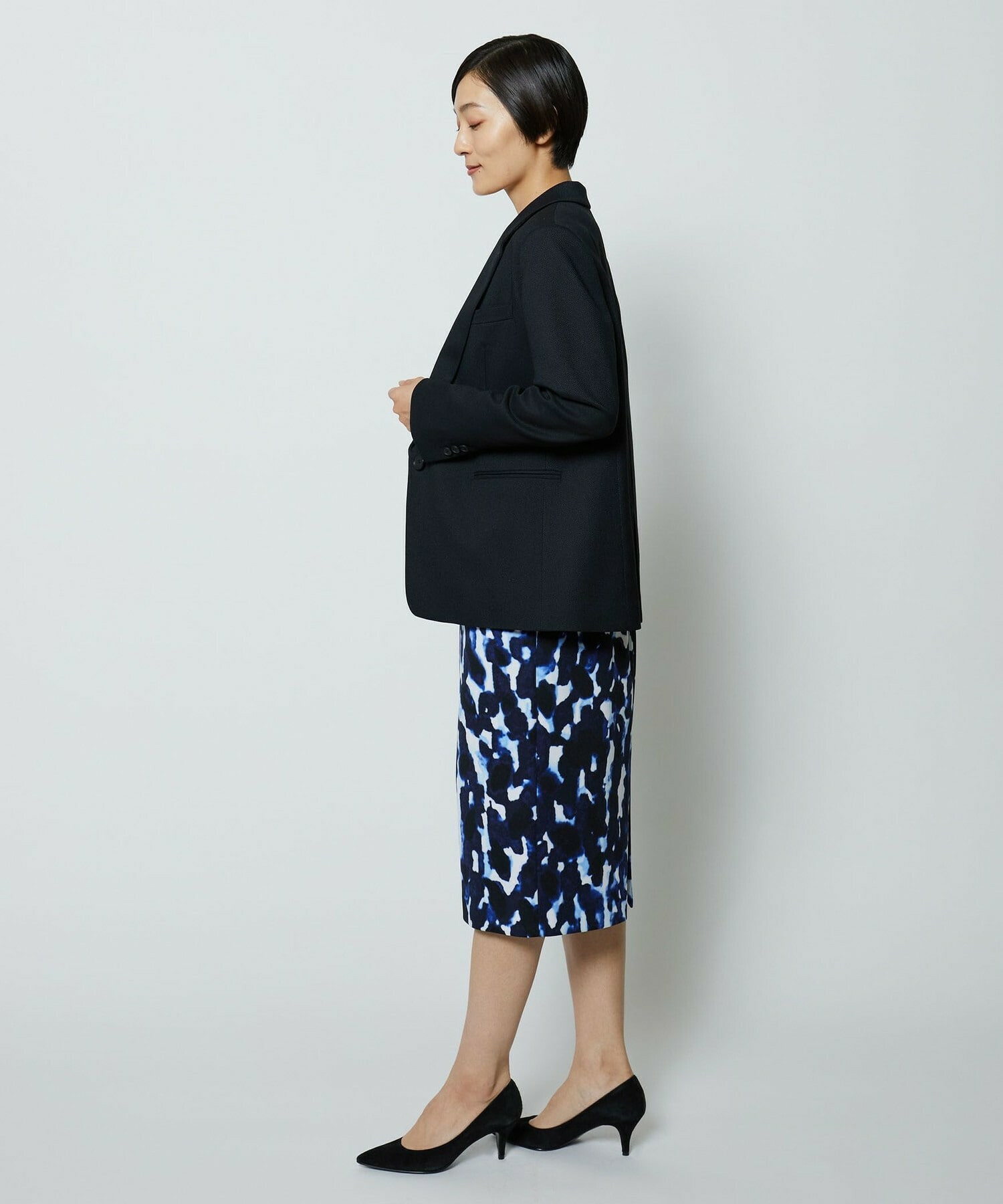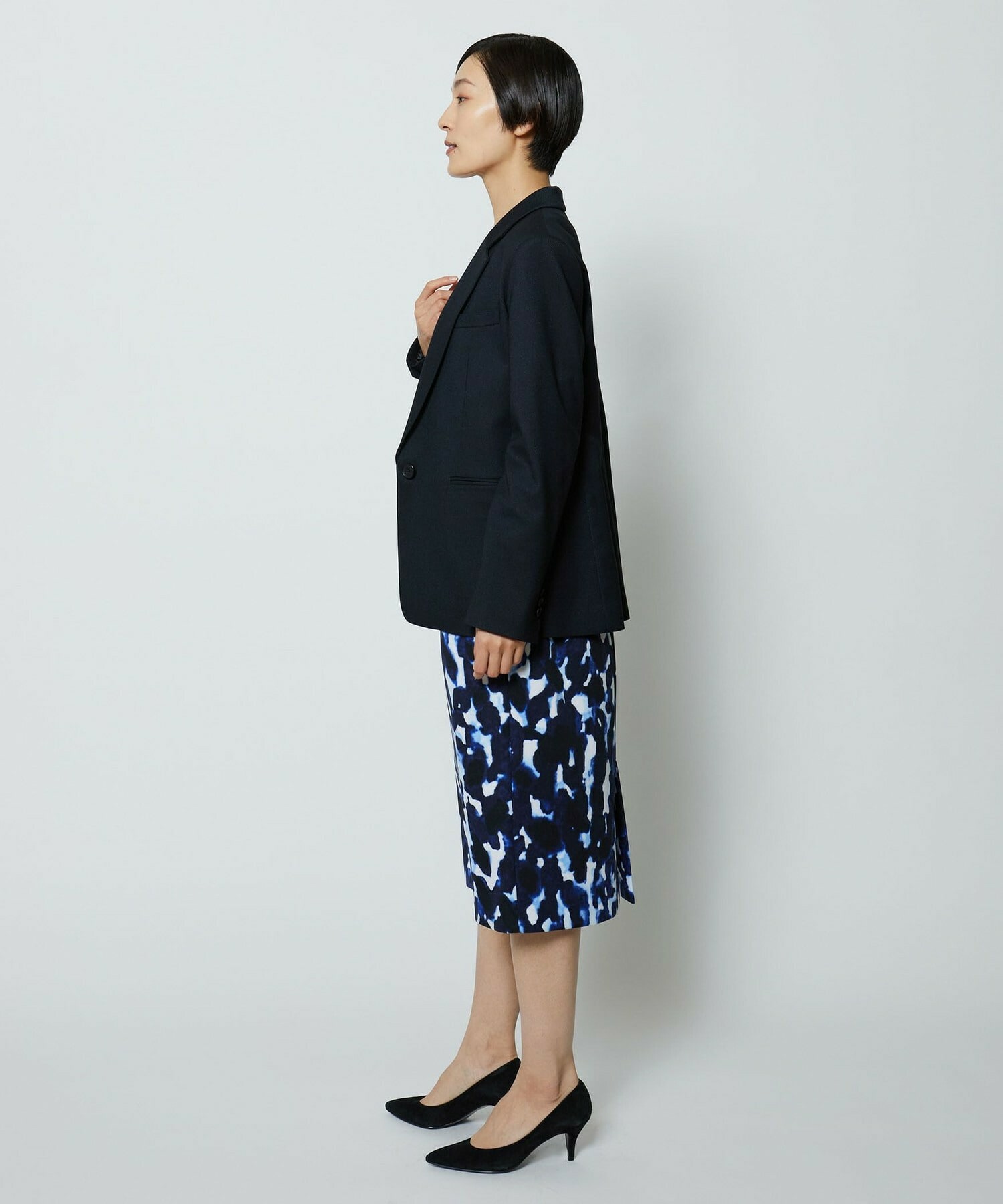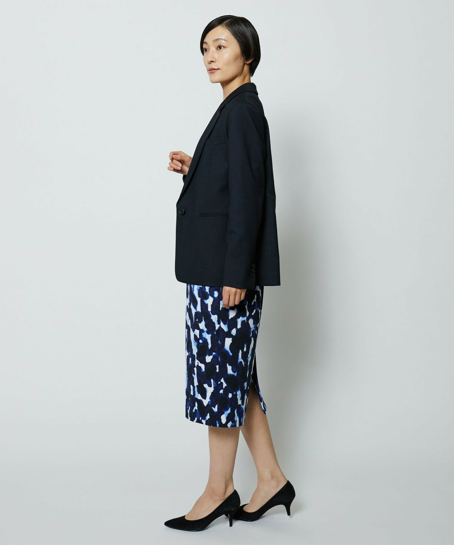 同素材のタイトスカートとセットアップの他、ミスティプリントのスカートとのコーディネートもオススメです。