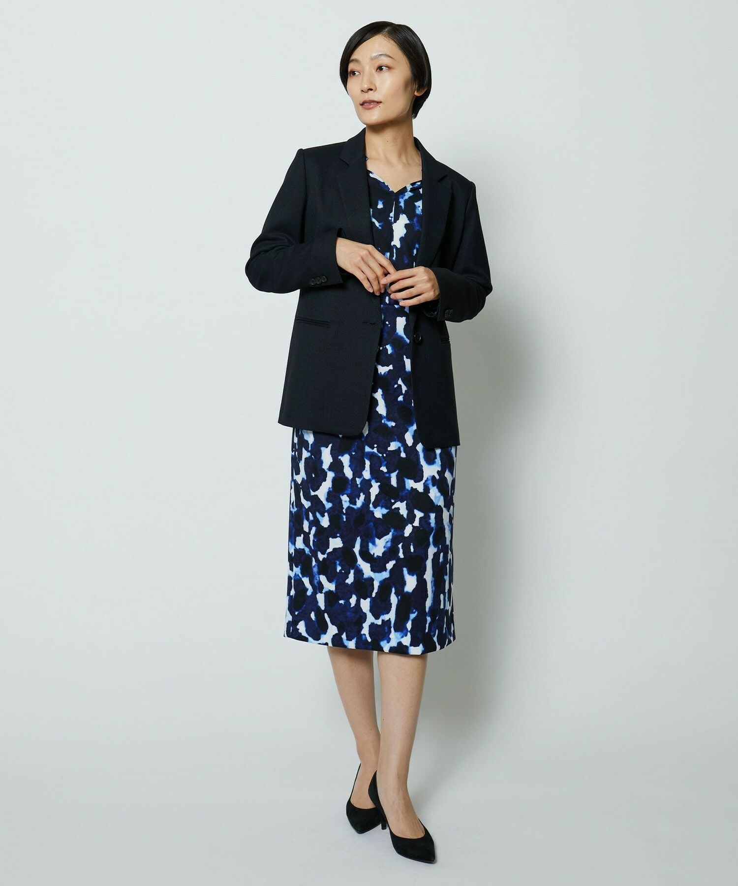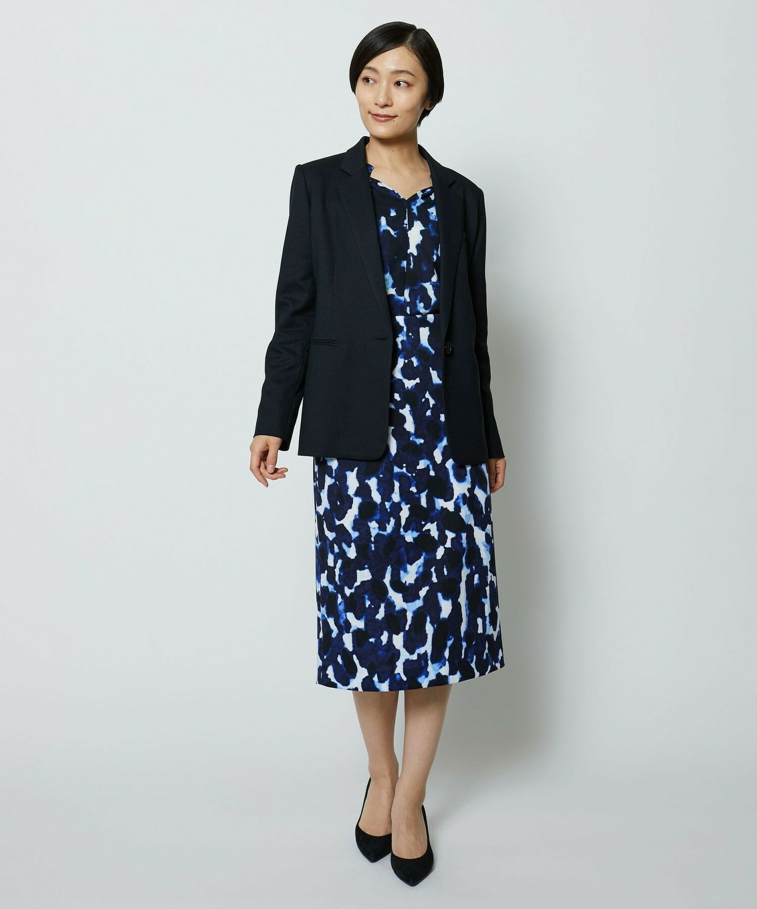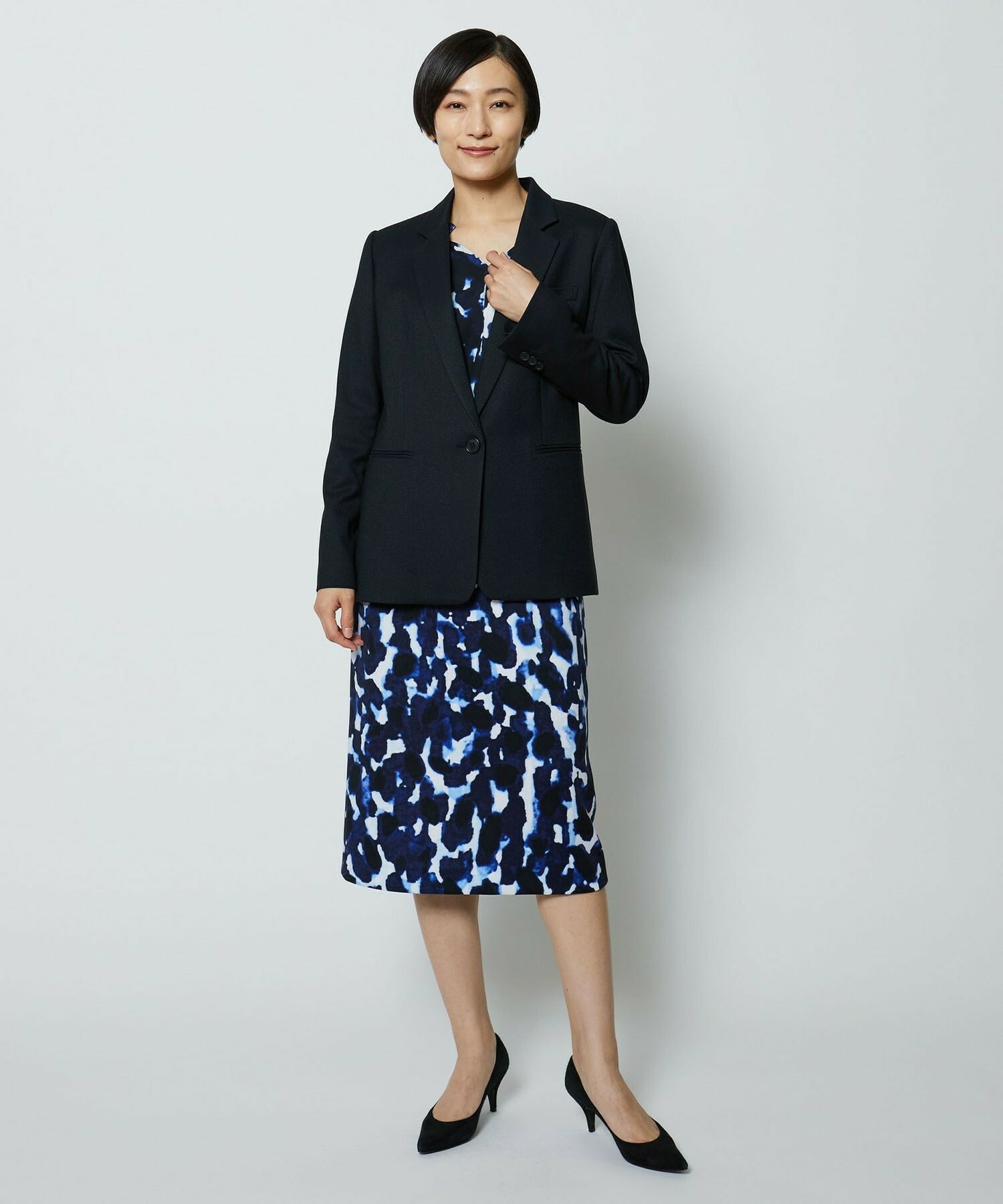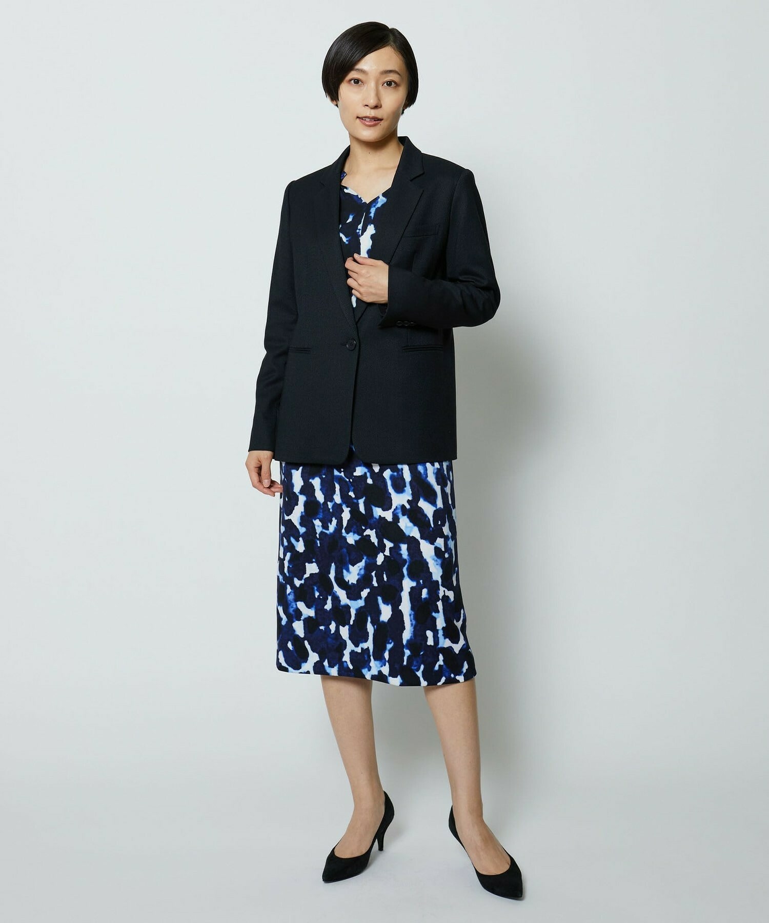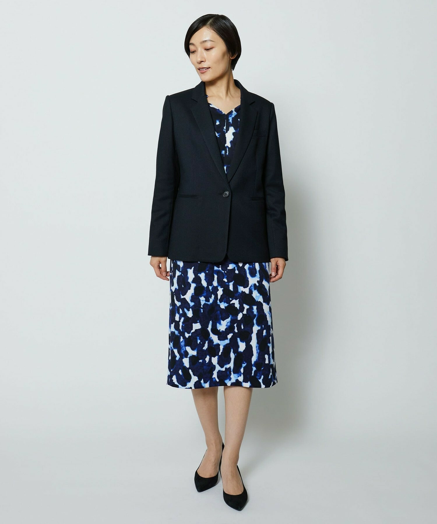 同素材のタイトスカートとセットアップの他、ミスティプリントのスカートとのコーディネートもオススメです。
