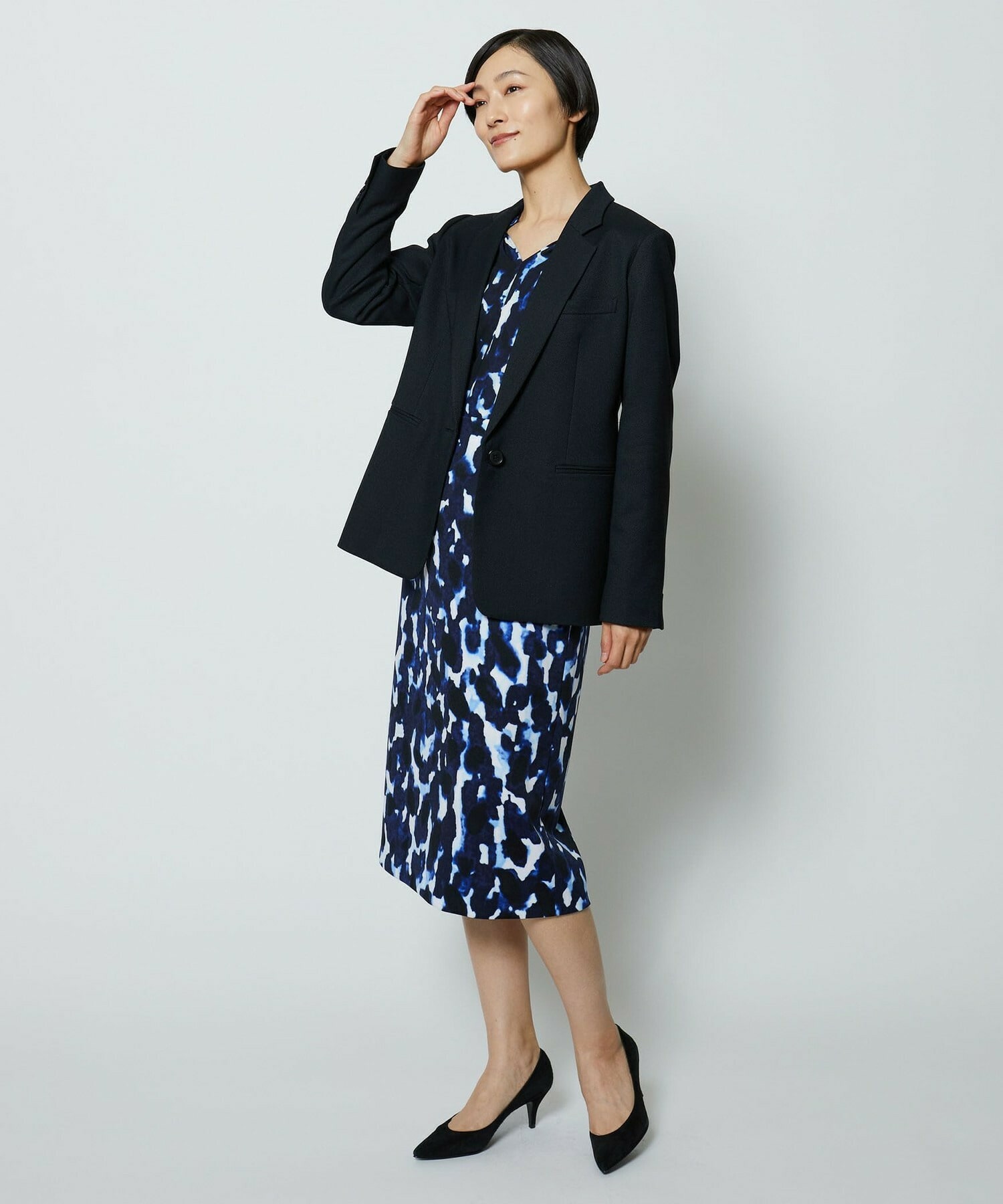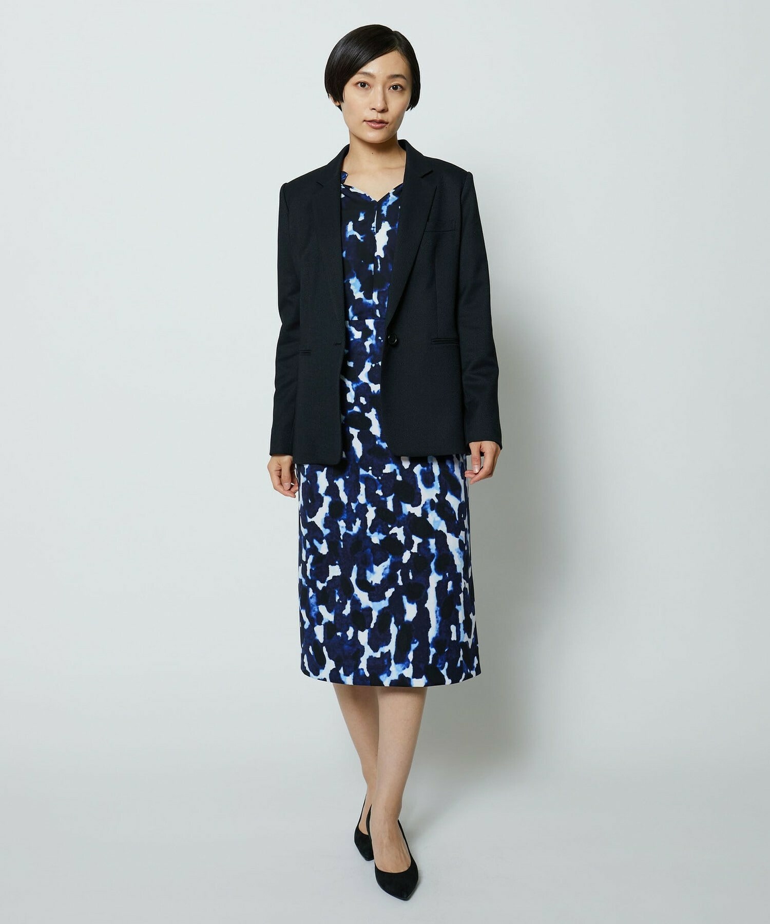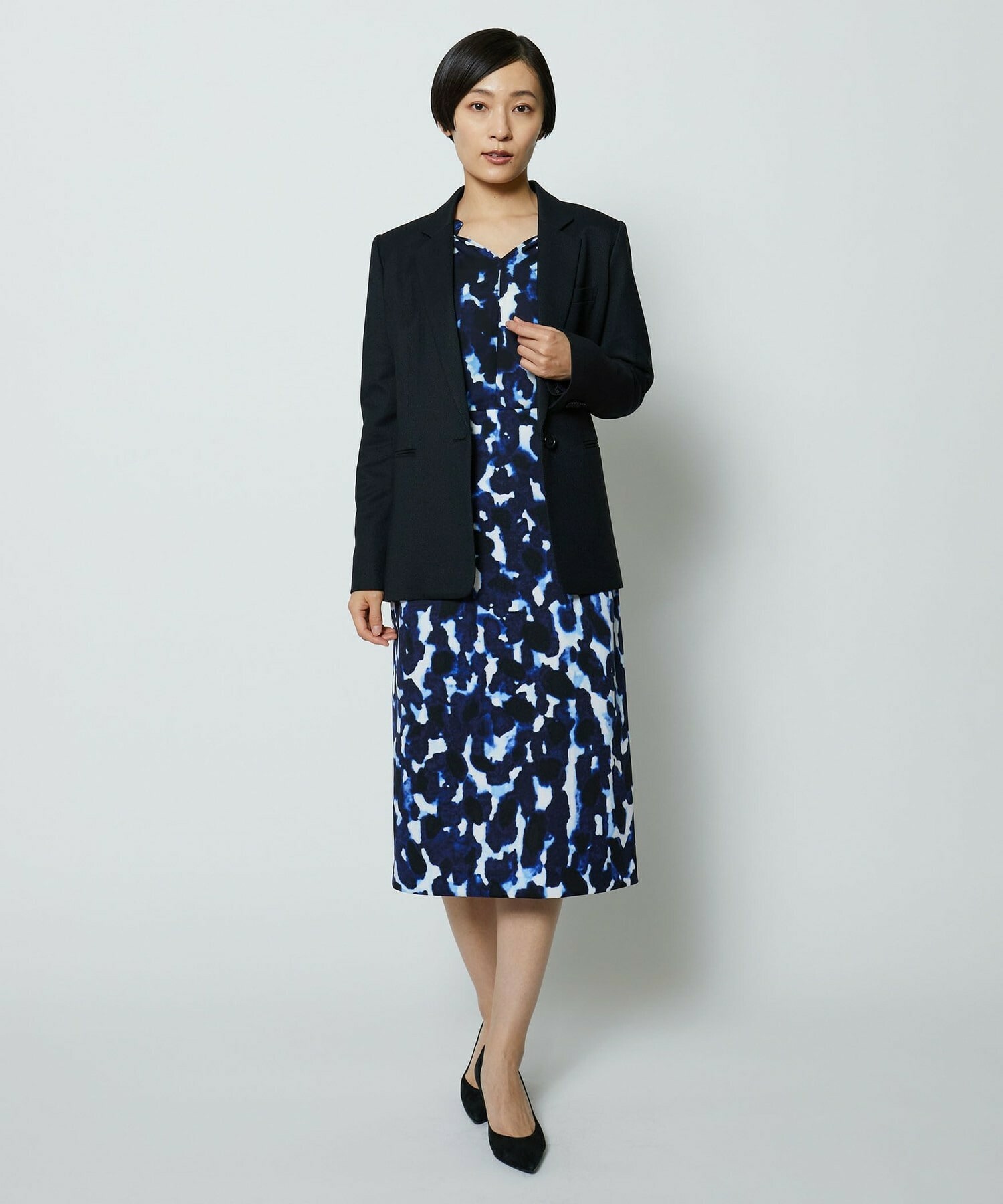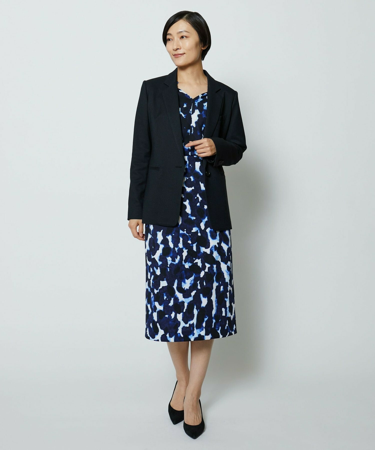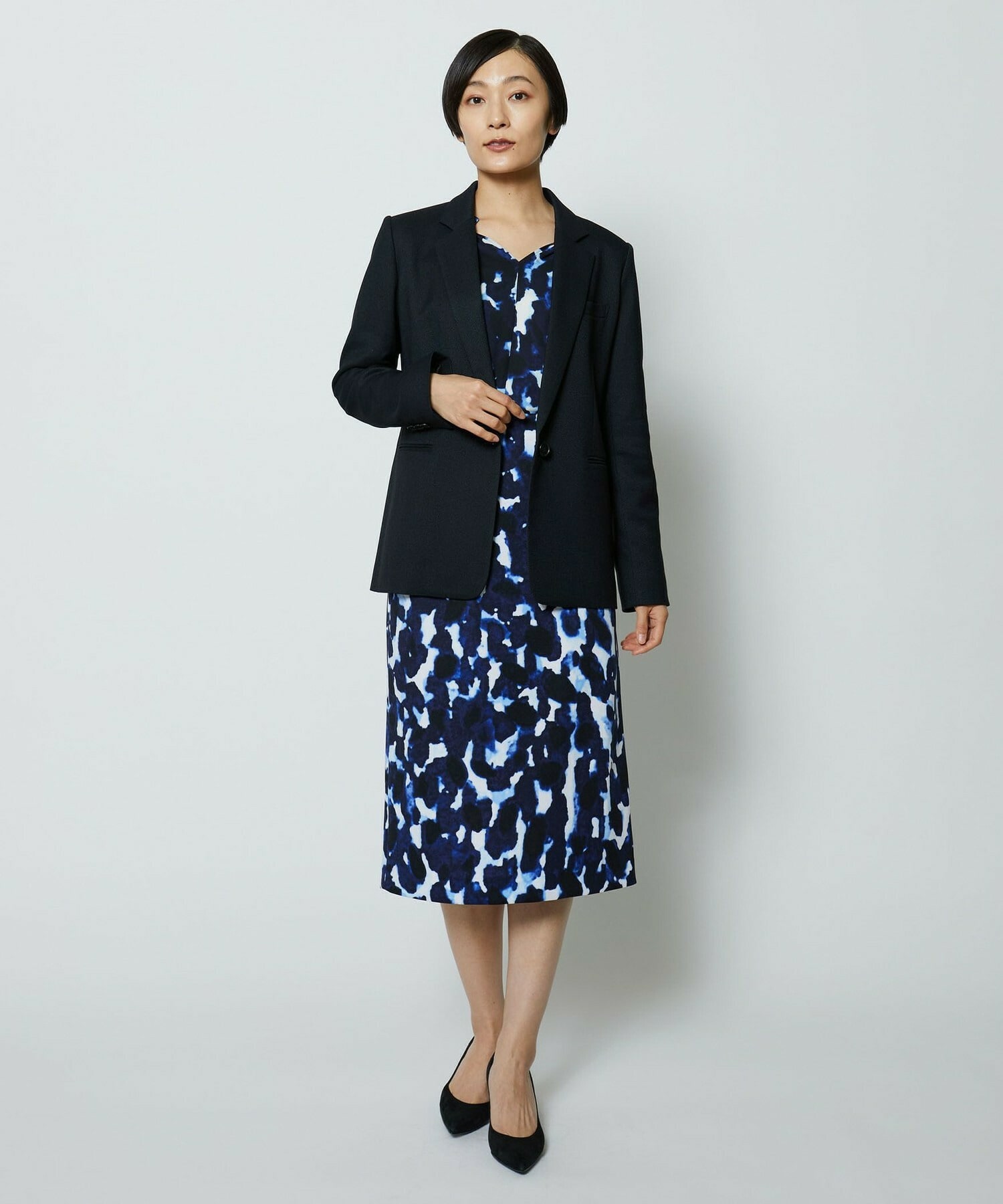 同素材のタイトスカートとセットアップの他、ミスティプリントのスカートとのコーディネートもオススメです。